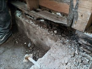 土台が完全にやられていたので削れるだけ削り新しい木材を補強として抱かせて土台の代わりにします。