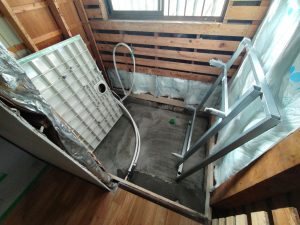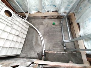 水道屋さん、電気屋さんの仕込みが終われば床にコンクリートを流してシステムバスの土台を作ります。