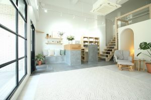 店舗スペースとして何もない状態だったところから、グレー×ホワイトを基調とした北欧テイストの空間へと生まれ変わりました♪