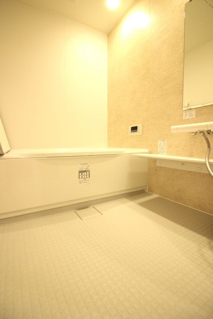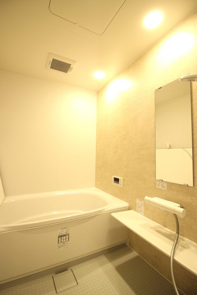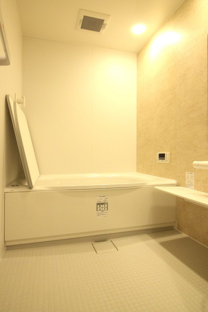 浴室はベージュとホワイトを基調としたデザインになっており、洗面台と統一された空間に仕上がりました。